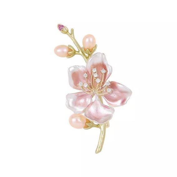 Broszka w kształcie kwiatu wiśni zdobiona kryształkami i perłami. Subtelny, romantyczny dodatek, który pięknie uzupełni eleganckie i codzienne stylizacje.