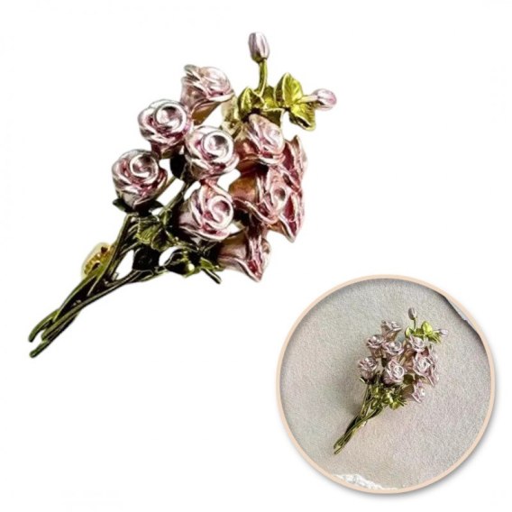 Broszka Bukiet RÓŻ – Romantyczna, Artystyczna Emalia Róż/Stare Złoto Elegancka broszka w formie bujnego bukietu miniaturowych róż. Artystyczne, emaliowane wykończenie w odcieniach pudrowego różu i patynowanego złota nadaje jej szlachetny, vintage'owy charakter. Design: Szczegółowy, rzeźbiarski bukiet kwiatów. Kolorystyka: Pudrowy róż, zieleń liści i postarzane złoto. Wymiary: 5,3 cm×2,4 cm – piękny, wydłużony kształt. Komfort: Antyalergiczna (bez niklu i chromu). Idealna na: Prezent, do eleganckich sukienek, swetrów i płaszczy.