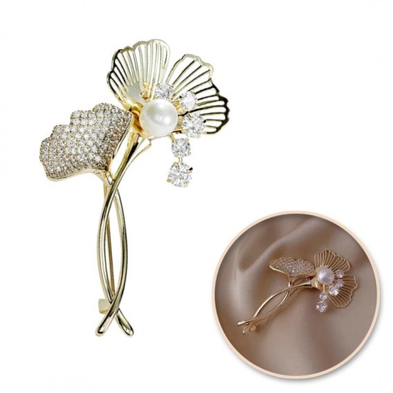 • Centralna Perła: W samym sercu broszki osadzona jest elegancka perła otoczona dodatkowymi cyrkoniami, które imitują kiść owoców miłorzębu.