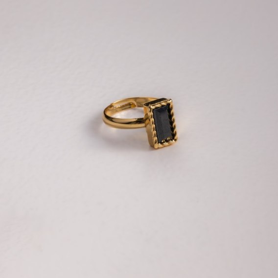 Pierścionek z czarną cyrkonią – LUMINOIR. Wyrazisty akcent w złotej oprawie. Czarna cyrkonia o szlifie baguette – elegancja w nowoczesnym wydaniu.