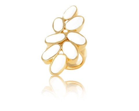 Pozłacany, regulowany pierścionek, ręcznie malowany na biało, wykonany z owalnych elementów tworzących jedną całość. Wymiary elementu ozdobnego 4,5 cm/ 2cm.